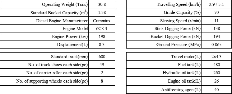 Weight: 30.8T      Bucket capacity: 1.38m3